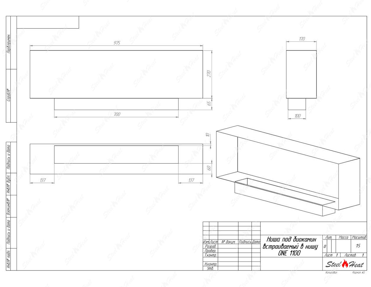 Встраиваемый Биокамин SteelHeat ONE-V 1100 предназначен для встраивания в глухие ниши из гипсокартона, кирпича, пеноблоков, бетона.